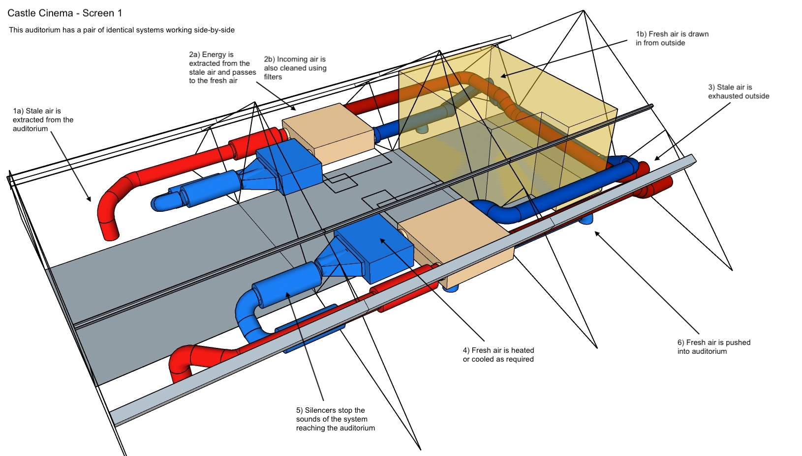 An MVHR system offers significant benefits in terms of increased comfort, lower energy costs and reduced carbon emissions. These ventilation systems are designed to ensure the cinema enjoys continuous fresh, clean air whilst retaining most of the energy that has already been used in heating or cooling the space to a comfortable temperature.